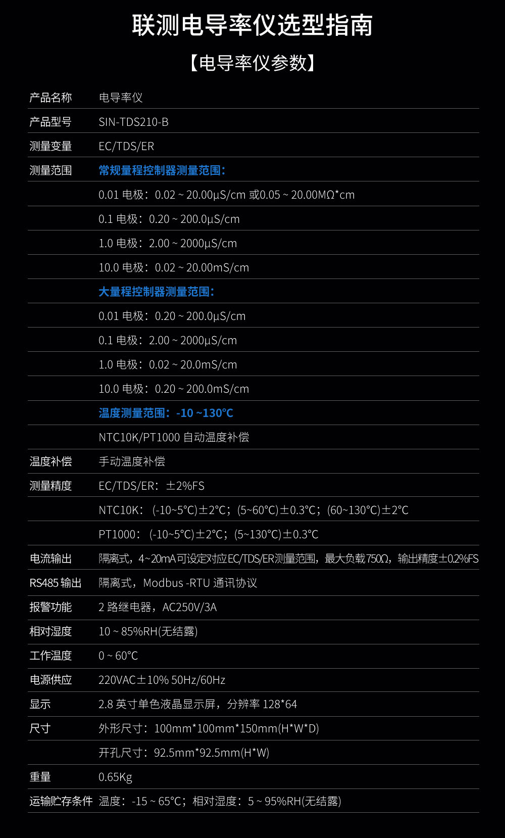 IN-TDS210-B工業(yè)電導(dǎo)率儀表,廣泛應(yīng)用于火電、化工化肥、冶金、環(huán)保、制藥、生 化、食品和自來(lái)水等行業(yè)??刂破髦饕獙?duì)溶液中的電導(dǎo)率/總?cè)芙夤腆w/ 電阻率和溫度進(jìn)行連續(xù)監(jiān)測(cè)。