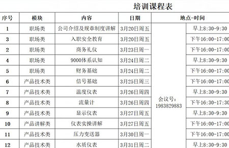 此次培訓(xùn)會(huì)主要圍繞公司規(guī)章制度、入職安全、商務(wù)禮儀等職場(chǎng)類知識(shí)以及水質(zhì)、溫度、壓力等儀表基礎(chǔ)知識(shí)兩方面展開(kāi),并邀請(qǐng)了公司里十余位經(jīng)驗(yàn)豐富的資深講師。