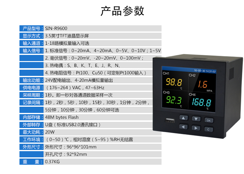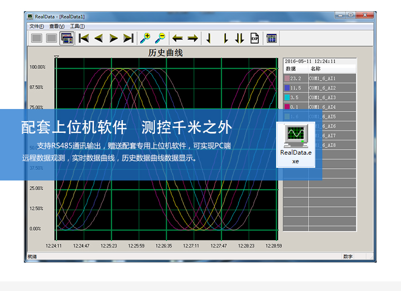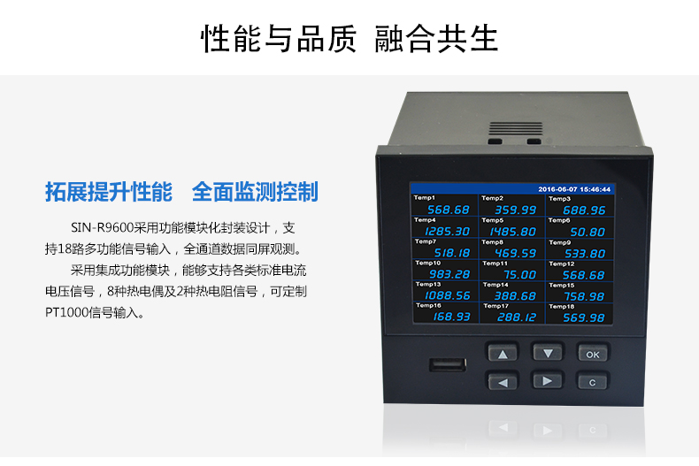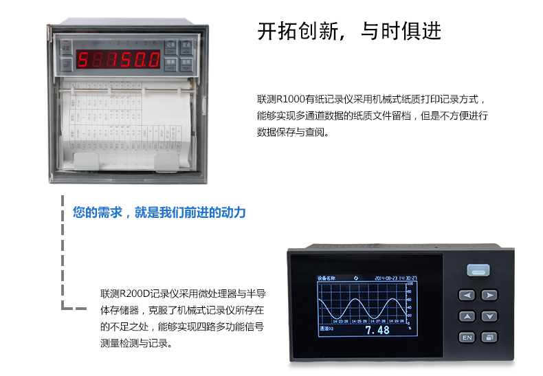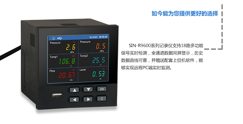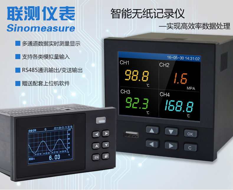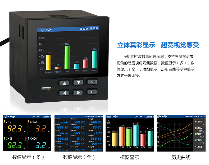 無(wú)紙記錄儀是將采集的數(shù)據(jù)/運(yùn)算數(shù)據(jù)以時(shí)間為基軸記錄在儀器內(nèi)部的存儲(chǔ)系統(tǒng)中,無(wú)消耗任何常用的記錄設(shè)施,如:紙張、筆墨。記錄在儀器內(nèi)部的存儲(chǔ)數(shù)據(jù),通過(guò)運(yùn)算、模擬后顯示在液晶屏。常用顯示用液晶屏比較廣泛。在液晶屏屏幕上,可以顯示數(shù)字顯示、棒圖顯示、曲線顯示、報(bào)警列表等。無(wú)紙記錄儀采集的數(shù)據(jù),常用的有:溫度、壓力、流量、液位、電壓、電流、濕度、頻率、振動(dòng)、轉(zhuǎn)速等。