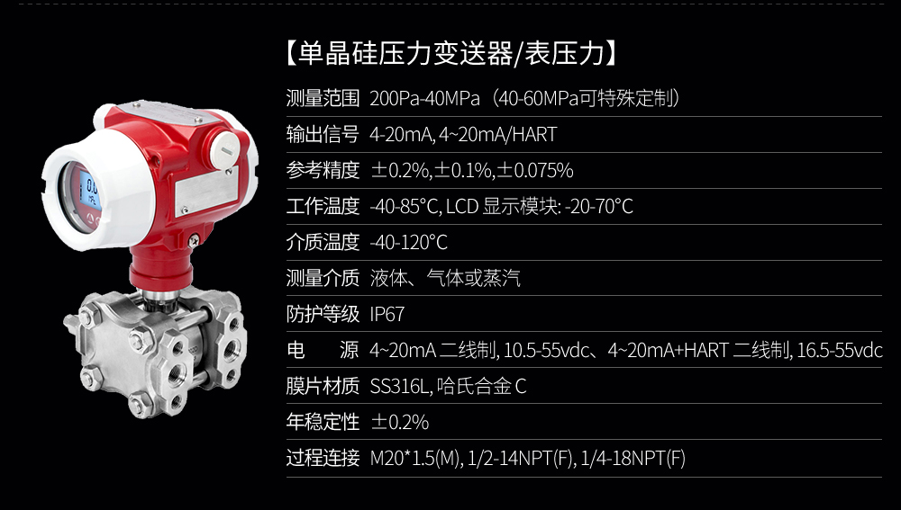 單晶硅壓力變送器用于測(cè)量液體、氣體或蒸汽的液位、密度、壓力,然后將其轉(zhuǎn)變成4-20mAHART電流信號(hào)輸出