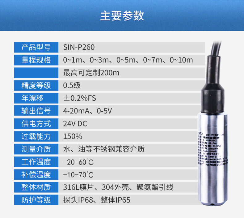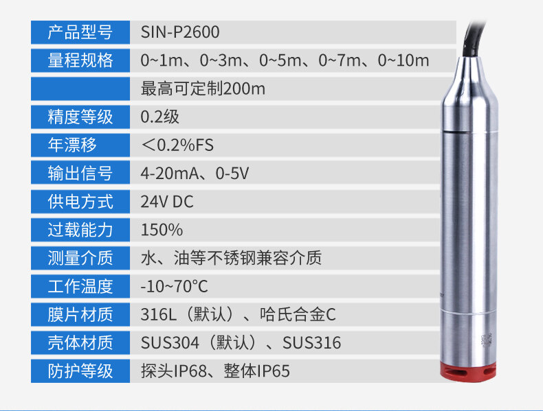 SIN-P260/P2600投入式液位變送器由高性能擴(kuò)散硅壓阻式壓力傳感器作為測(cè)量元件,把與液位深度成正比的液體靜壓力準(zhǔn)確測(cè)量出來,并經(jīng)過信號(hào)調(diào)理電路轉(zhuǎn)換成標(biāo)準(zhǔn)(電流或電壓)信號(hào)輸出,建立起輸出信號(hào)與液體深度的線性對(duì)應(yīng)關(guān)系,實(shí)現(xiàn)對(duì)液體深度的測(cè)量。